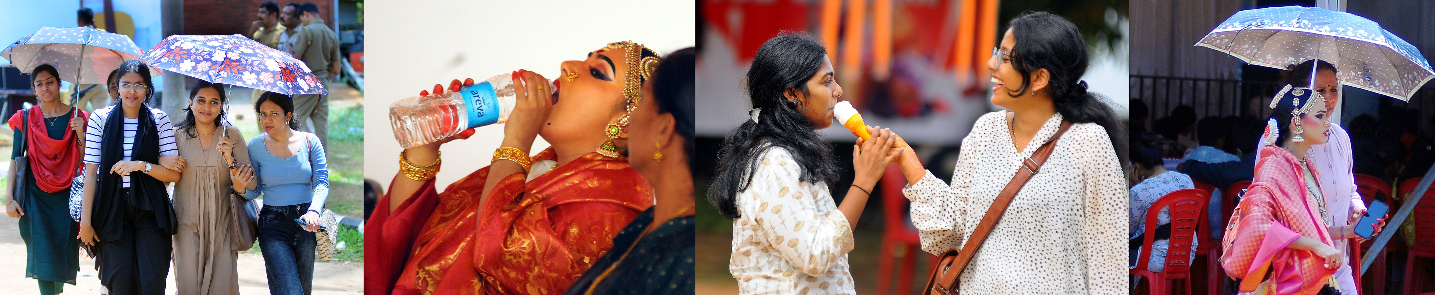 മത്സരാര്ഥികള് ഗ്രീന് റൂമുകളില് നിന്നും മേക്കപ്പിട്ട് ഇനങ്ങള്ക്കൊത്ത വസ്ത്രവും ധരിച്ച് ഒരുങ്ങി പുറത്തിറങ്ങി കുടയും ചൂടിയാണ് വേദികളിലേക്ക് പോയത്. കാണികളുള്പ്പെടെ പലരും ദാഹമകറ്റാന് തുടര്ച്ചയായി കുടിവെള്ളത്തെ ആശ്രയിച്ചു. കാണികളായെത്തിയ രക്ഷിതാക്കള് ഉള്പ്പെടെ മുതിര്ന്നവരില് പലരും കുപ്പിവെള്ളവും കയ്യില് കരുതിയാണ് വന്നത്. കാമ്പസിനുള്ളില് വിവിധയിടങ്ങളിലായി സജ്ജീകരിച്ചിരുന്ന ശീതളപാനീയ കടകളില് വന് തിരക്കാണ് അനുഭവപ്പെട്ടത്. കൂട്ടമായെത്തിയ പലരും എസ്ക്രീമും ജ്യൂസുമൊക്കെ വാങ്ങി കാമ്പസിലെ മരത്തണലിലും മറ്റും അഭയം തേടി. വൈകിട്ട് നാലോടെ പെയ്ത മഴ ചൂടില് നിന്നും ആശ്വാസം പകര്ന്നു.